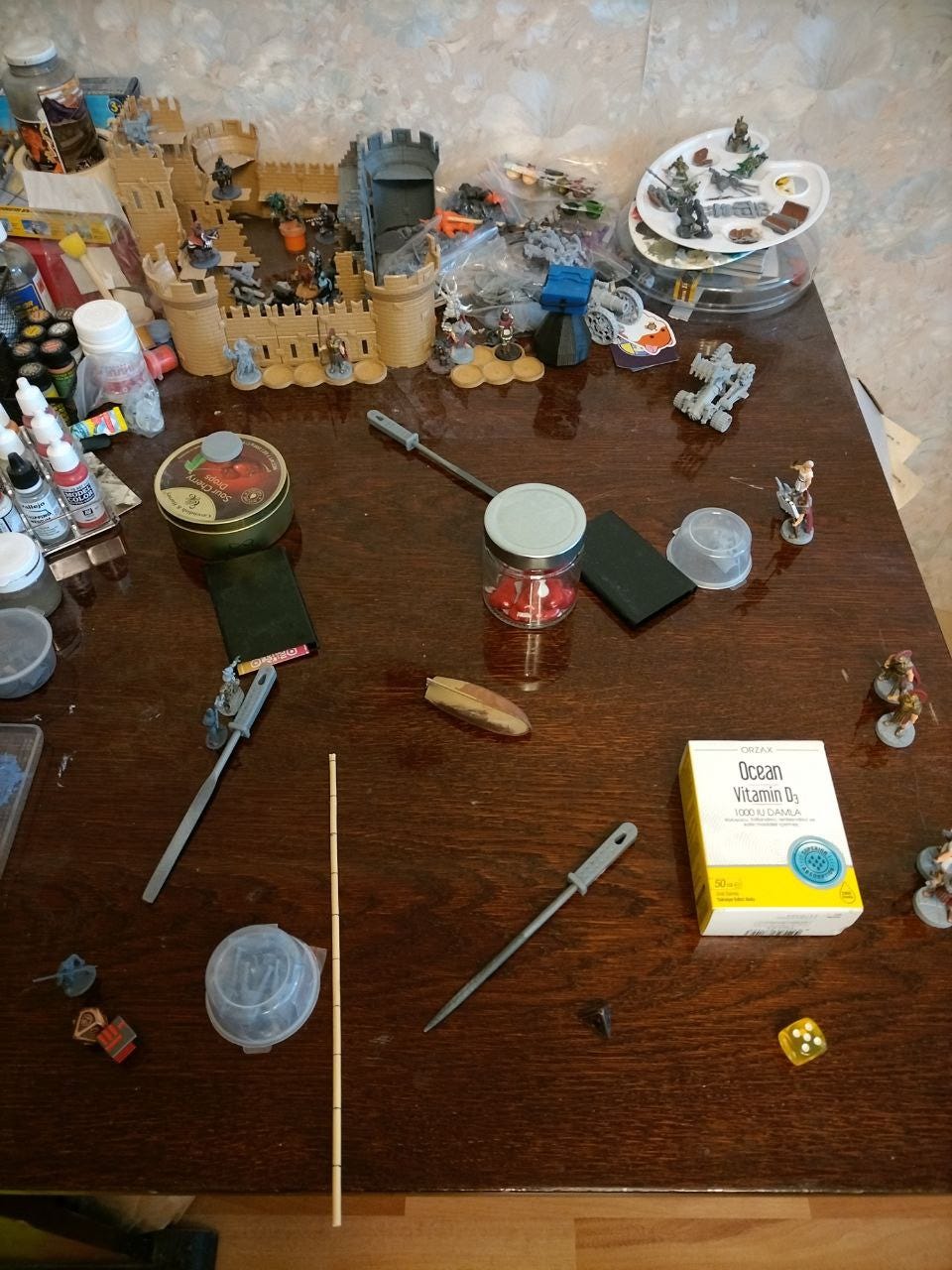 Полные затраты на этот бардак составили около 2 тысяч рублей, потраченных на начальный набор миниатюр и красок. Естественно, на варгеймы в целом я потратил куда больше - но для новичка, который хочет купить дюжину солдатиков и сыграть свою первую игру, этого достаточно. На прощание прилагаю фото импровизированного террейна, которым игрался первый бой кампейна - о нём в следующем посте.