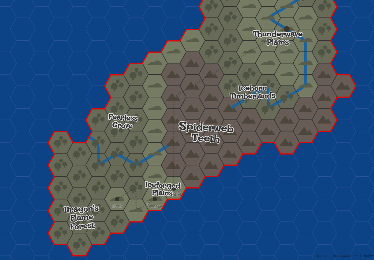 Следующим шагом стало создание, собственно, Пограничья - региона, где будет происходить игра. Его предлагается поделить на несколько абстрактных зон, в каждой из которых будут находиться персонажи в определенный ход. Так как картограф из меня аховый, а играть хотелось здесь и сейчас - я воспользовался сайтом Hexroll, так как помнил, что он делает приемлемого качества гексовые карты. Результат меня устроил (в общем-то, и запросы у меня были невысокими), и я начал дополнять карту.